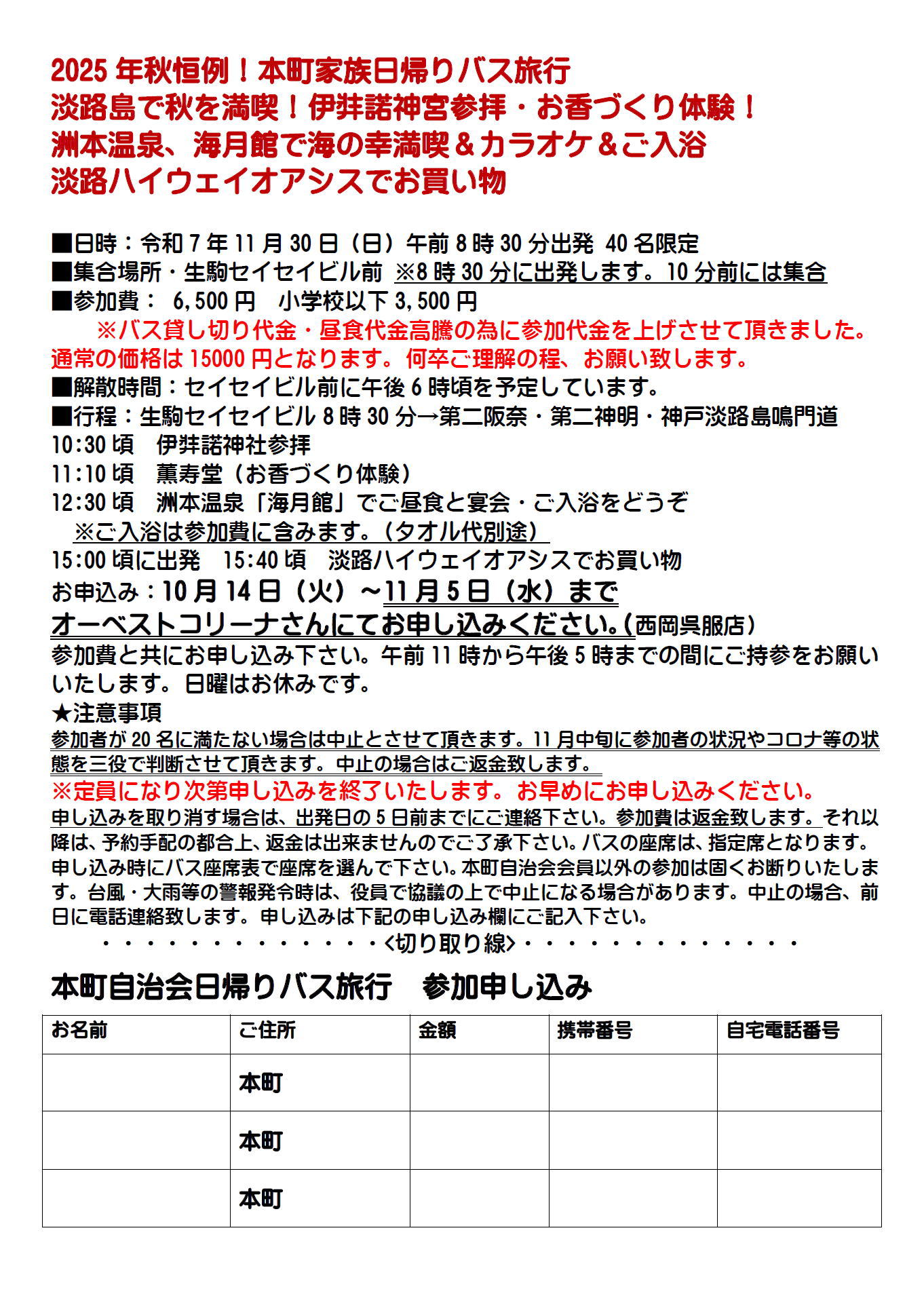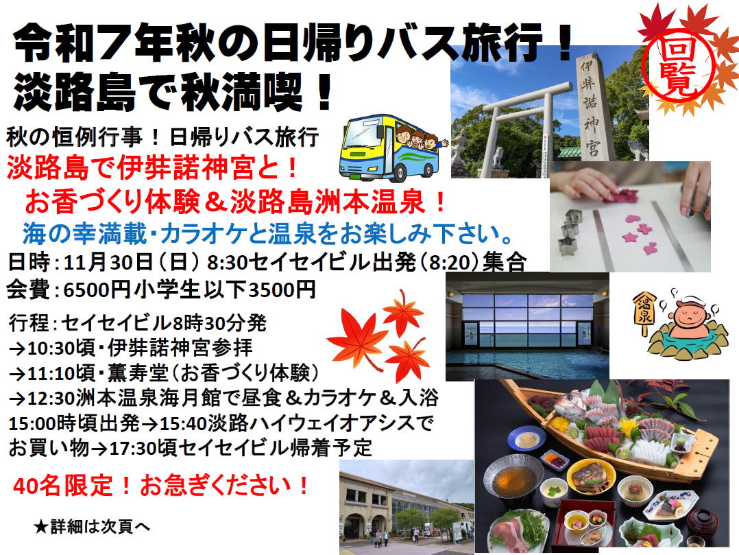 毎年!行っております日帰りバス旅行は今年は淡路島方面に出かけます。神話の伊弉諾神社を参拝して!自由な形のお香作りの体験!