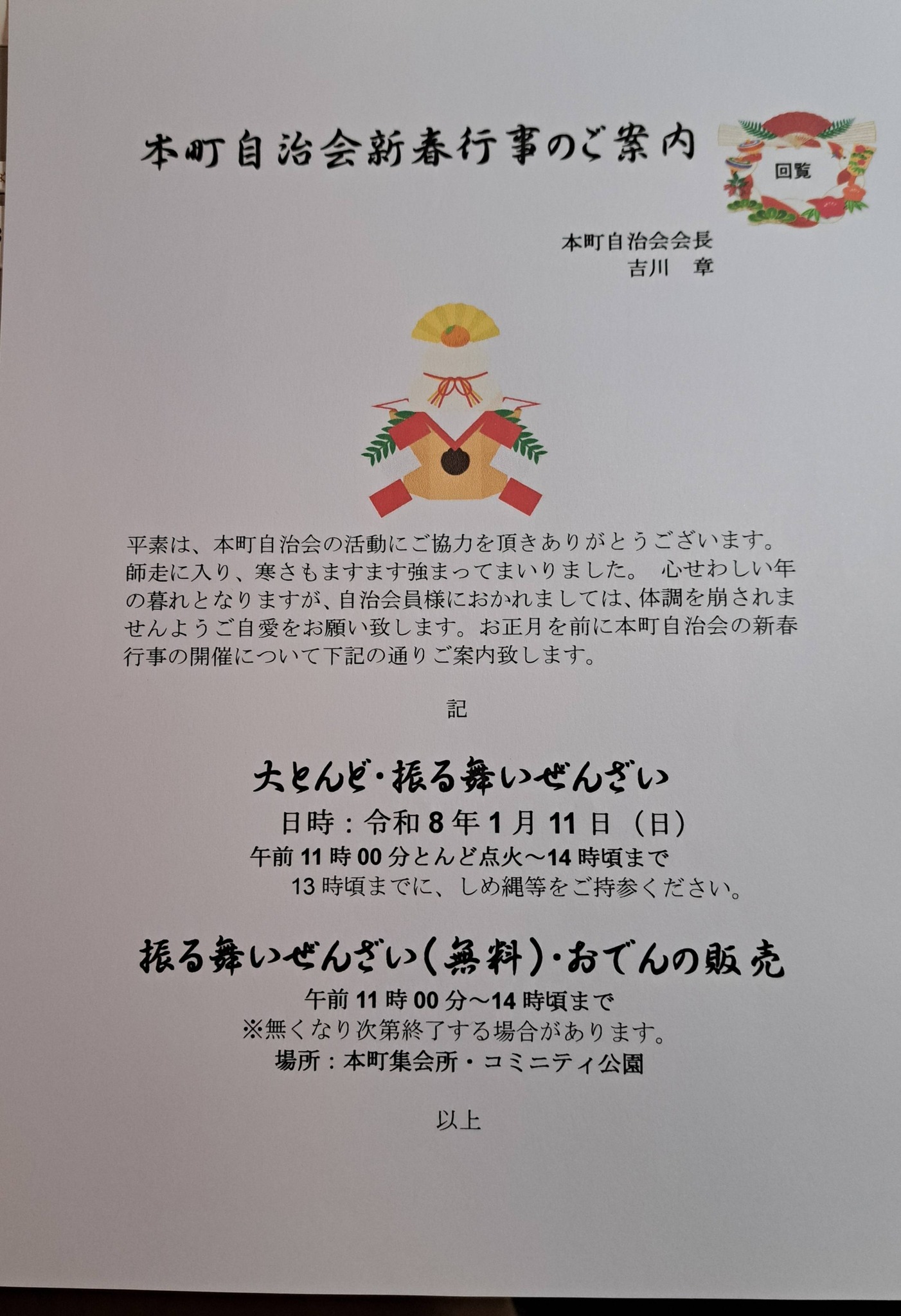 令和7年の最初のイベントである「大とんど&振舞いぜんざい&おでんの販売」を下記日時に開催いたします。新年のご挨拶の場として、また歓談の場所として是非、集会所にお集まり頂ければ幸いです。